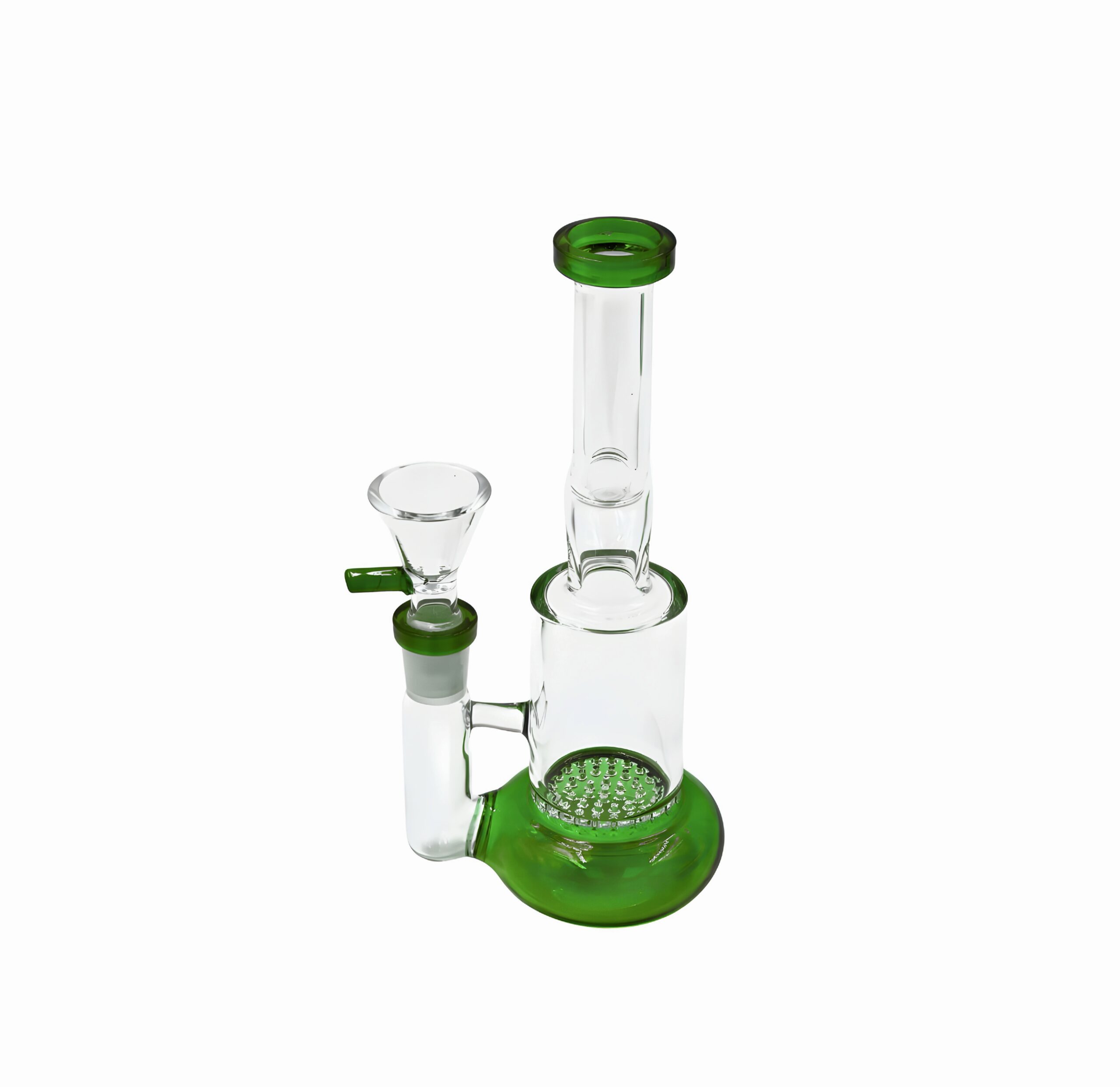 Crafted from high-quality borosilicate glass, this bong is built for durability and heat resistance. The journey of your smoke begins as it passes through the honeycomb percolator, a disc packed with numerous small holes.